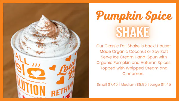 Pumpkin dreams, blended to perfection. Our Classic Pumpkin Spice Shake is back! House-made organic coconut or soy soft serve ice cream hand-spun with organic pumpkin and autumn spices. Topped with whipped cream and cinnamon.